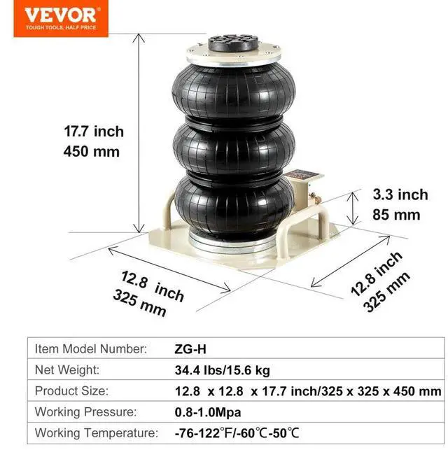 Lifting Height without Load: 5.5-17.7 inch/140 mm-450 mm,Working Pressure: 0.8-1.0Mpa,Normal Pressure Range: 8 kg/cm²,Working Temperature: -76-122/-60-50,Item Model Number: ZG-H,Net Weight: 34.4 lbs/15.6 kg,Product Size: 12.8 x 12.8 x 17.7 inch/325 x 325 x 450 mm