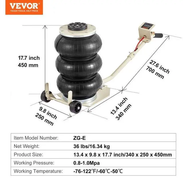 Lifting Height without Load: 5.5-17.7 inch/140 mm-450 mm,Working Pressure: 0.8-1.0Mpa,Normal Pressure Range: 8 kg/cm²,Working Temperature: -76-122/-60-50,Item Model Number: ZG-E,Net Weight: 36 lbs/16.34 kg,Product Size: 13.4 x 9.8 x 17.7 inch/340 x 250 x 450 mm
