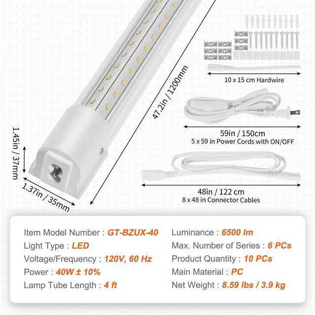 Voltage/Frequency: 120V, 60 Hz,Product Quantity: 10 PCs,Luminance: 5000 lm,Item Model Number: GT-BZUX-40,Light Type: LED,Anti-interference Function: Anti high frequency and anti RF interference,Lamp Tube Length: 4 ft /101.6 mm,Max. Number of Series: 6 PCs,Net Weight: 8.59 lbs/3.9 kg,Power: 40W ± 10%,Main Material: PC,Product Size: 47.2 x 1.37 x 1.45 in/1200 x 35 x 37 mm