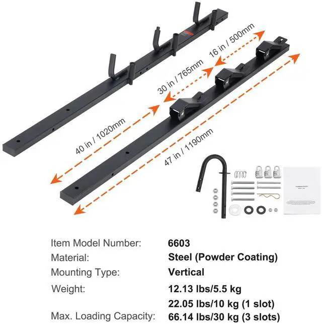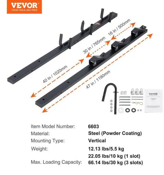 Item Model Number: 6603,Material: Steel (Powder Coating),Mounting Type: Vertical,Max. Loading Capacity: 22.05 lbs/10 kg (1 slot),66.14 lbs/30 kg (3 slots):,Weight: 12.13 lbs/5.5 kg