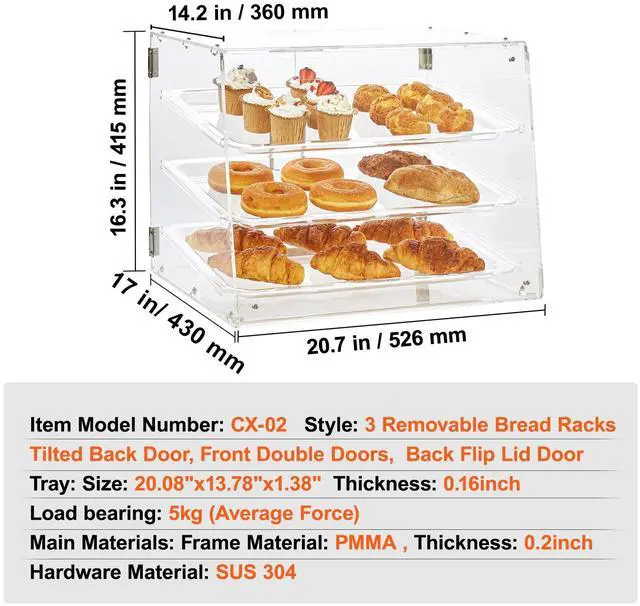 VEVOR Pastry Display Case, 3-Tier Commercial Countertop Bakery Display Case, Acrylic Display Box with Rear Door Access & Removable Shelves, Keep Fresh for Donut Bagels Cake Cookie, 20.7"x14.2"x16.3"