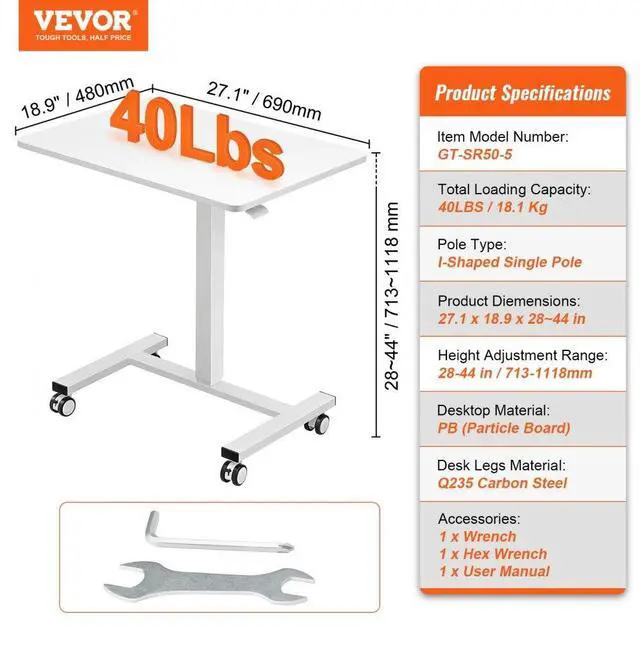 Table Legs Material: Q235 Carbon Steel,Height Adjustment Range: 28-44 in / 713-1118mm,Item Model Number: GT-SR50-5,Pole Type: I-Shaped Single Pole,Tabletop Material: PB (Particle Board),Total Loading Capacity: 40 LBS / 18.1 Kg,Product Dimensions: 27.1 x 18.9 x 28-44 in / 690 x 480 x 713~1118 mm