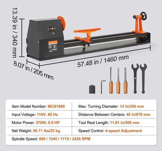 Spindle Speed: 885/1245/1715/2425 RPM,Max. Turning Diameter: 14 in/ 350 mm,Distance Between Centers: 40 in / 970 mm,Item Model Number: MCS1000,Motor Power: 370W, 0.5 HP,Input Voltage: 110V, 60 Hz,Tool Rest Length: 11.81 in/300 mm,Speed Control: Four-speed Adjustment,Product Dimensions: 57.48 x 8.07 x 13.39 in/1460 x 205 x 340 mm,Net Weight: 50.71 lbs/23 kg