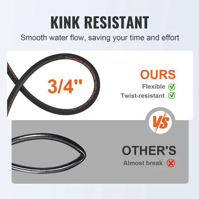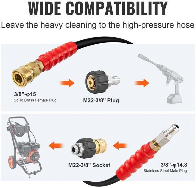VEVOR Pressure Washer Hose, 100FT, Kink Free 3/8"-14.8 Male, 3/8"-15 Female For Most Brand Pressure Washers, 4.9'' Bending Radius, 4800 PSI Heavy Duty Power Washer Extension Replacement Hose