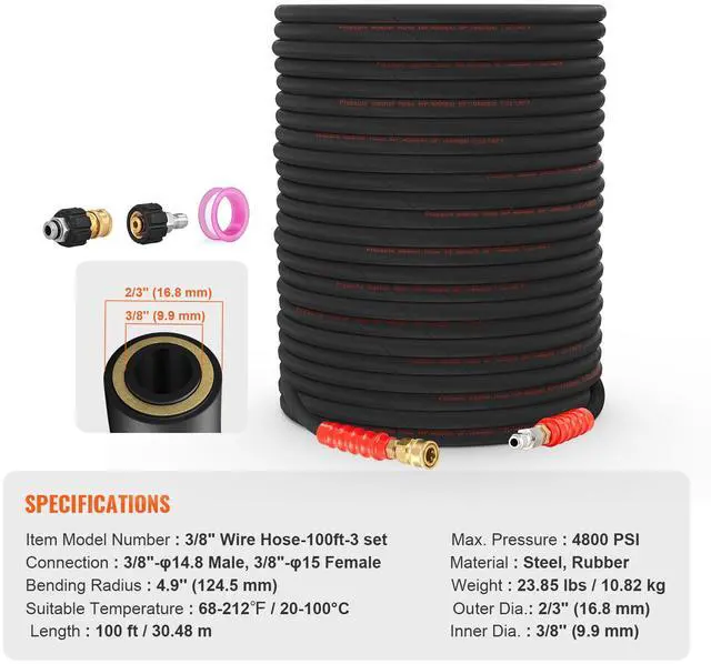 Item Model Number: 3/8" Wire Hose-100ft-3 set,Connection: 3/8"-14.8 Male, 3/8"-15 Female,Material: PVC, Polyester,Bending Radius: 4.9'' (124.5 mm),Suitable Temperature: 68-212 / 20-100,Max. Pressure: 4800 PSI,Item Weight: 23.85 lbs / 10.82 kg