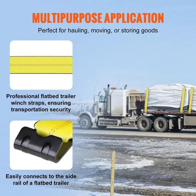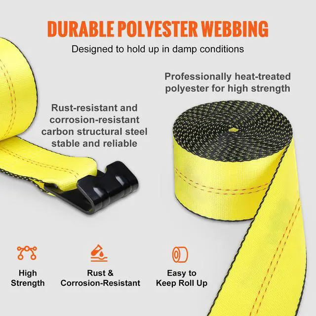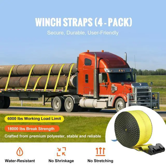VEVOR Winch Straps, 4" x 30', 6000 lbs Load Capacity, 18000 lbs Break Strength, Truck Straps with Flat Hook, Flatbed Tie Downs Cargo Control for Trailers, Farms, Rescues, Tree Saver, Yellow (4 Pack)