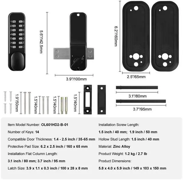 Hollow Stud Length: 1.5 inch / 40 mm,Latch Size: 3.9 x 1.1 x 0.3 inch / 100 x 28 x 8 mm,Installation Flat Column Length: 3.1 inch / 80 mm, 3.7 inch / 95 mm,Protective Pad Size: 6.2 x 2.5 inch / 160 x 65 mm,Item Model Number: OL601HD2-B-01,Product Weight: 1.2 kg / 2.7 lbs,Material: Zinc Alloy,Product Dimensions: 5.8 x 4.0 x 5.9 inch / 149 x 103 x 150 mm,Compatible Door Thickness: 1.4 - 2.5 inch / 35-65 mm,Installation Screw Length: 1.5 inch / 40 mm, 1.9 inch / 50 mm