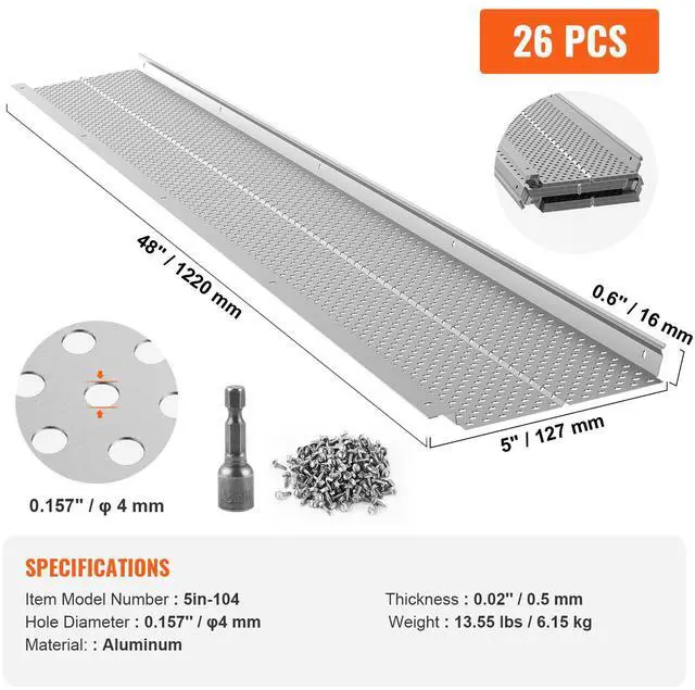 Thickness: 0.02'' / 0.5 mm,Total Length: 104 ft / 31.7 m,Single Board Size: 48'' x 5'' x 0.6'' / 1220 x 127 x 16 mm,Item Model Number: 5in-104,Material: Aluminum,Hole Diameter: 0.157'' / 4 mm,Quantities: 26 PCS,Item Weight: 13.55 lbs / 6.15 kg