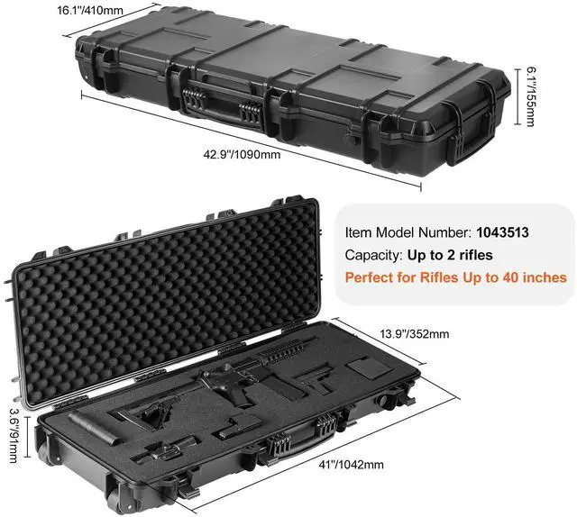 TSA Standard: YES,Waterproof: IP67,Capacity: Up to 2 rifles (For Rifles up to 40 inch),Casters: 2 pcs,Item Model Number: 1043513,Latch: 4 pcs,Pressure Relief Valve: YES,Casters Diameter: 2.2 in/55 mm,Internal Size: 41x13.9x3.6in/1042x352x91 mm,Main Material: PP,Weight: 12.79 lbs/5.80 kg,Product Size: 42.9x16.1x6.1in/1090x410x155 mm
