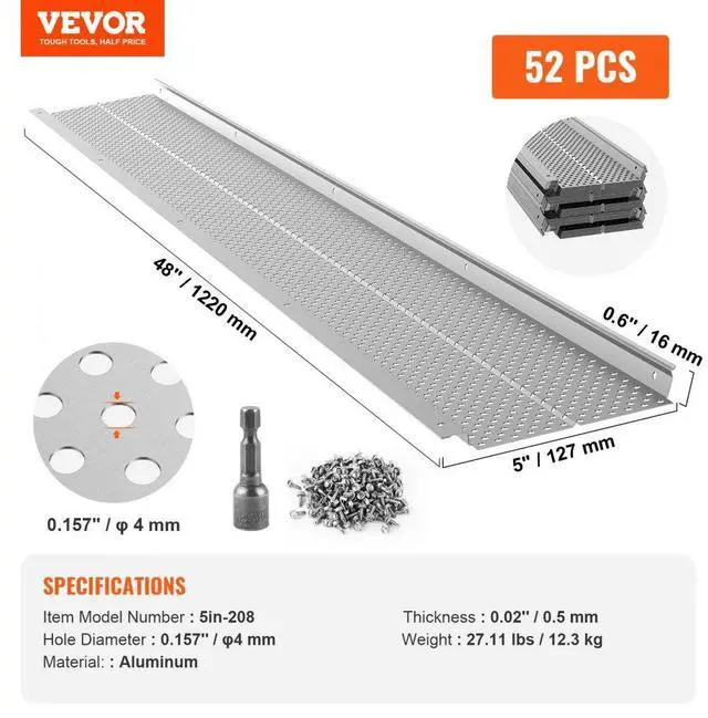 Thickness: 0.02'' / 0.5 mm,Total Length: 208 ft / 63.4 m,Single Board Size: 48'' x 5'' x 0.6'' / 1220 x 127 x 16 mm,Item Model Number: 5in-208,Material: Aluminum,Hole Diameter: 0.157'' / 4 mm,Quantities: 52 PCS,Item Weight: 27.11 lbs / 12.3 kg