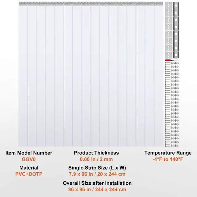 Single Strip Size (L x W): 7.9 x 96 in/20 x 244 cm,Item Model Number: GGV0,Temperature Range: -4 to 140,Material: PVC+DOTP,Product Thickness: 0.08 in/2 mm,Overall Size after Installation: 96 x 96 in/244 x 244 cm