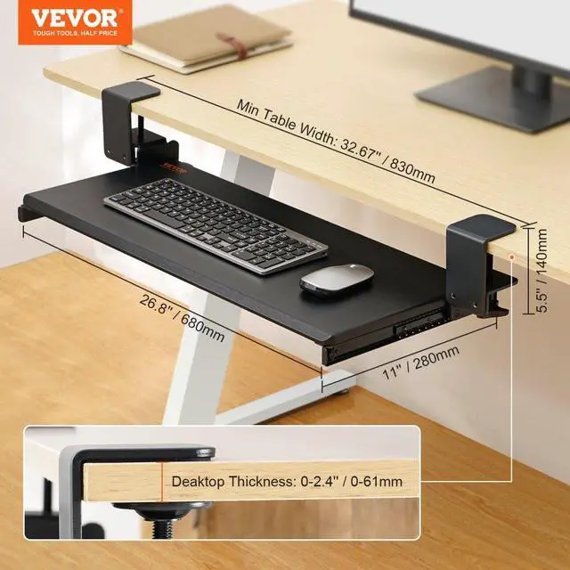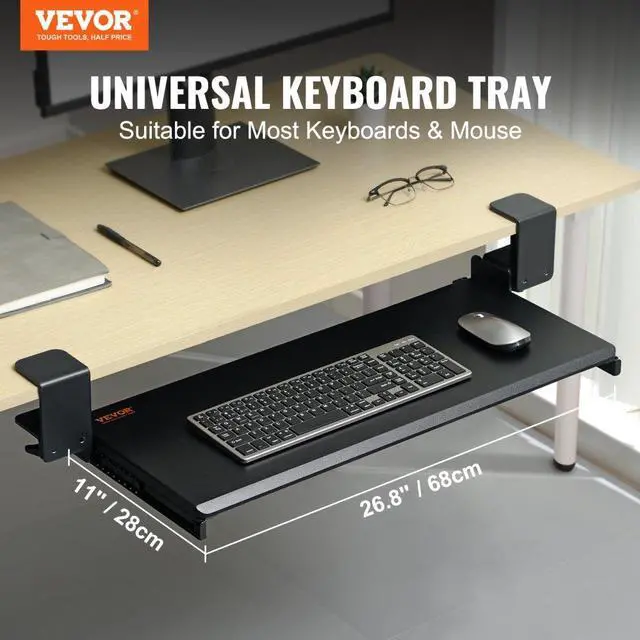 Perfect Large Size: Measuring 26.8 x 11 inches, our clamp on keyboard tray under desk is designed to hold most standard keyboards, mice, and all your extra knick-knacks. Its larger size effectively reduces clutter on the main desk surface, creating a cleaner and more organized workspace.