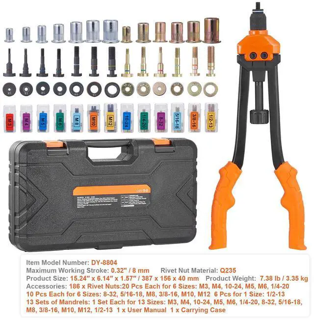 Rivet Nut Material: Q235,Item Model Number: DY-8804,Product Weight: 7.38 lbs / 3.35 kg,Maximum Working Stroke: 0.3" / 8 mm,Product Size: 15.24 x 6.14 x 1.57 / 387 x 156 x 40 mm