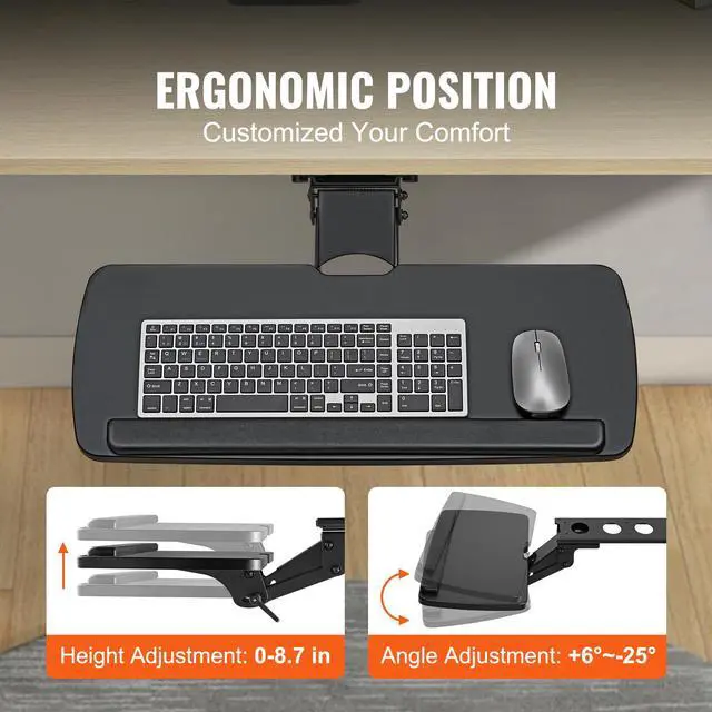 VEVOR Keyboard Tray under Desk Adjustable Height, Height and Angle Adjustable under Desk Keyboard Tray Slide out, Large 25x9.8 inch Keyboard Holder under Desk for Typing in Home, Office Work