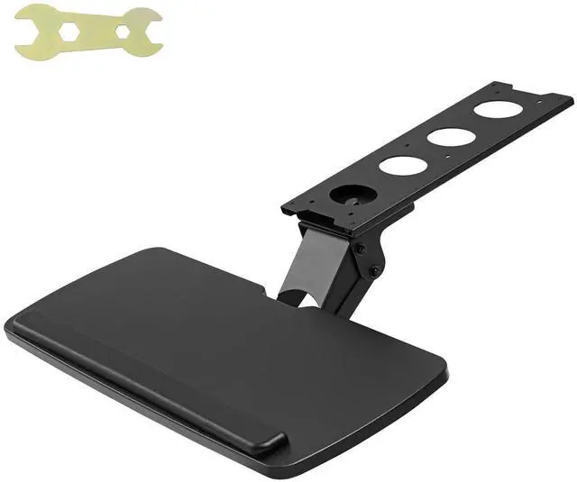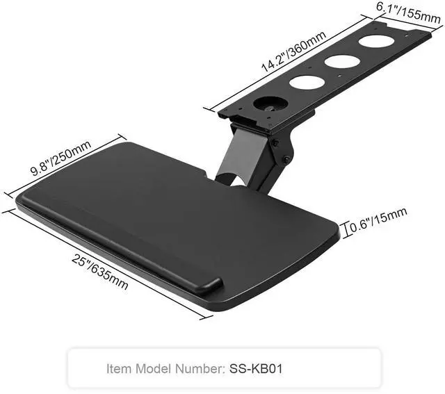 Angle Adjustable: +6°; -25°,Height Adjustable: 0-8.7 in / 0-220 mm,Sliding Length: 9.5 in / 241 mm,Item Model Number: PE-KB01,Swivel: 180°,Load Bearing: MAX 11 lbs / 5 kg,Main Material: MDF Board + Q235 Carbon Steel Frame,Weight: 10.25 lbs / 4.65 kg,Keyboard Tray Size: 9.8 x 25 in/250 x 635 mm