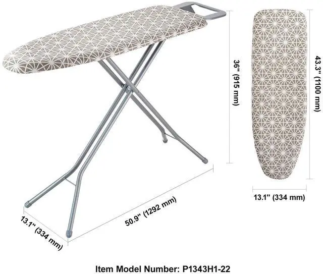 Adjustable Height: 28.1-36in/715-915 mm,Cover: 1 x 100% Cotton Cover + 1 x Heat-resistant Cover,Item Model Number: P1343H1-22,Max. Loading: 44 lbs/20 kg,Product Weight: 9.59 lbs/4.35 kg,Layer Material: PP Panel+Sponge+ Needle Cotton + Heat-resistant Silver-plated Cover,Ironing Board Size: 43.3''x13.1''/1100x334 mm,Main Material: PP Panel+Sponge+ Needle Cotton + Heat-resistant Silver-plated Cover + Q235 frame,Product Size: 50.9x13.1x36 in/1292x334x915 mm