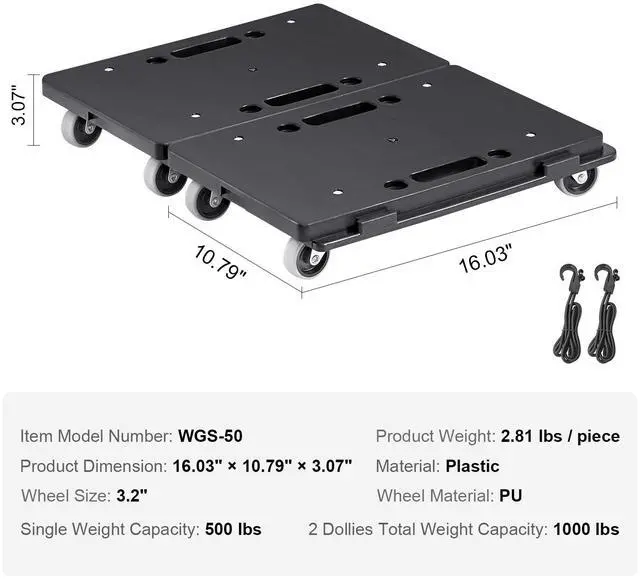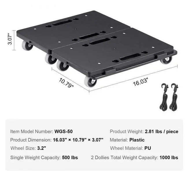 Single Dolly Weight: 2.81 lbs/1.3 kg,Wheel Size: 3.2"/81.3 mm,Item Model Number: WGS-50,Material: Plastic,Single Weight Capacity: 500 lbs/227 kg,2 Dollies Total Weight Capacity: 1000 lbs/454 kg,Wheel Material: PU,Product Size: 16.03" x 10.79" x 3.07"/407.2 x 274.1 x 78 mm