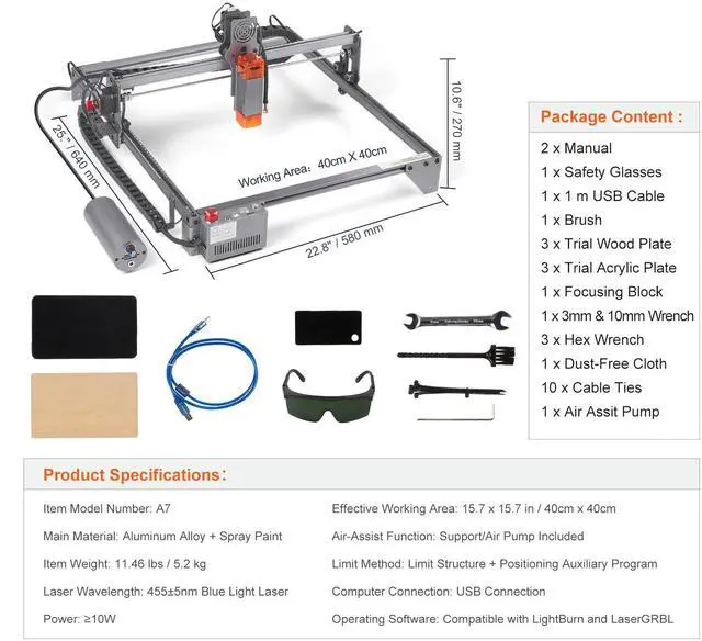 Air-Assist Function: Support / Air Pump Included,Product Size(L x W x H): 25.2 x 22.8 x 10.6 in / 640 x 580 x 270 mm,Effective Working Area: 15.7 x 15.7 in / 40cm x 40cm,Item Model Number: A7,Laser Wavelength: 455±5nm Blue Light Laser,Limit Method: Limit Structure + Positioning Auxiliary Program,Computer Connection: USB Connection,Main Material: Aluminum Alloy + Spray Paint,Item Weight: 11.5 lbs / 5.2 kg,Power: 10W,Operating Software: Compatible with LightBurn and LaserGRBL