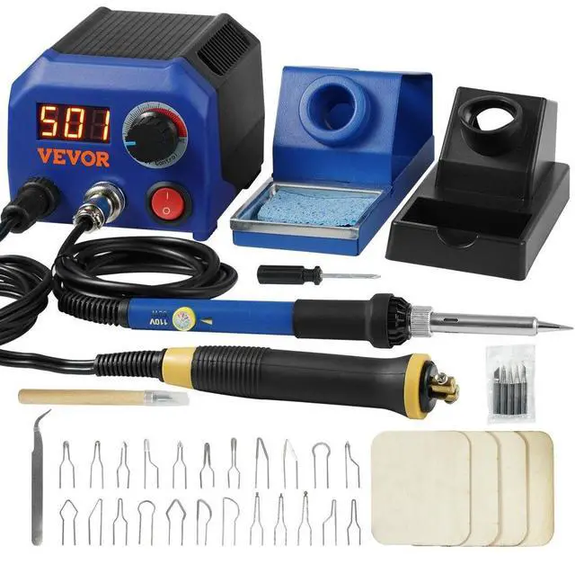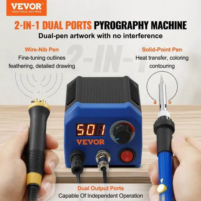 VEVOR Wood Burning Kit, 250~700°C Adjustable Temperature with Display, Dual Output Port with 2 Pyrography Pens, 23 Wire Nibs, 5 Solid-Point Tips, 2 Pen Holder, 4 Wood Chip, 1 Tweezers, 1 Sponge