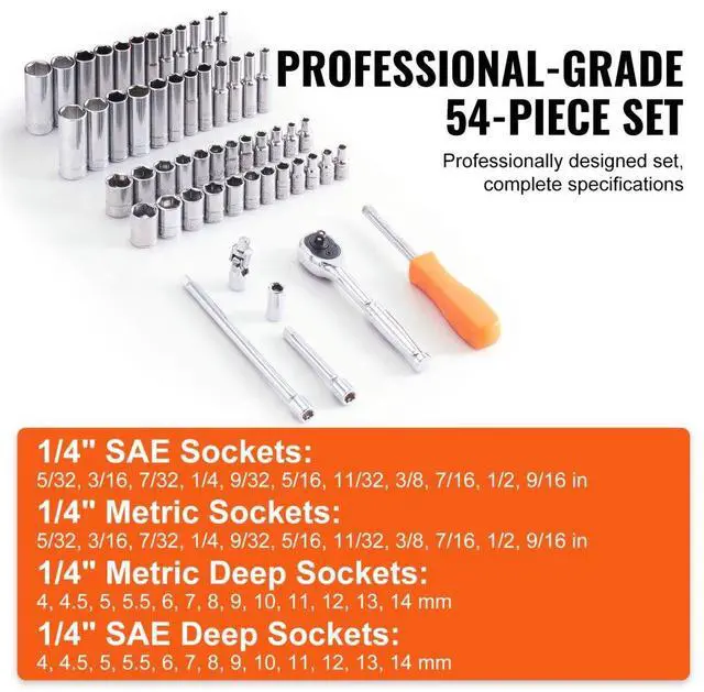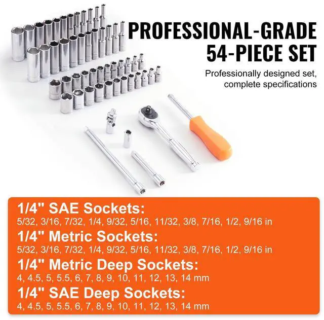 VEVOR Socket Set, 1/4 Inch Drive Socket and Ratchet Set, 6-Point Socket Opening, 54 Pieces Tool Set SAE and Metric, Deep and Standard Sockets, 5/32-9/16 in, 4-14 mm, with Accessories, Storage Case