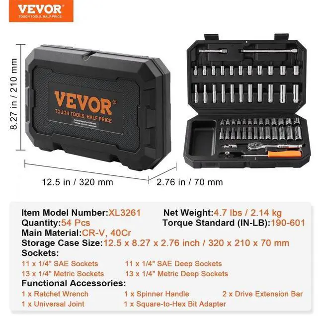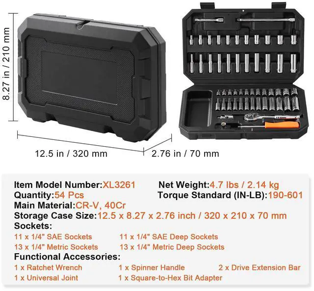 Torque Standard: 190-601 in-lb,Item Model Number: XL3261,Quantity: 54 Pcs,Storage Case Size: 12.5 x 8.27 x 2.76 inch / 320 x 210 x 70 mm,Net Weight: 4.7 lbs / 2.14 kg,Main Material: CR-V, 40Cr