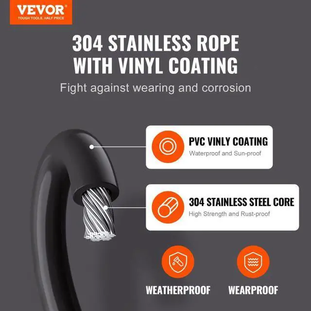 VEVOR Vinyl Coated Wire Rope Kit, 3/32 Cable Through 1/16 Diameter Stainless Steel, 7x7 Strands Construction with 189 Accessories for String Lights, Clothesline, Vine, 164 ft Black