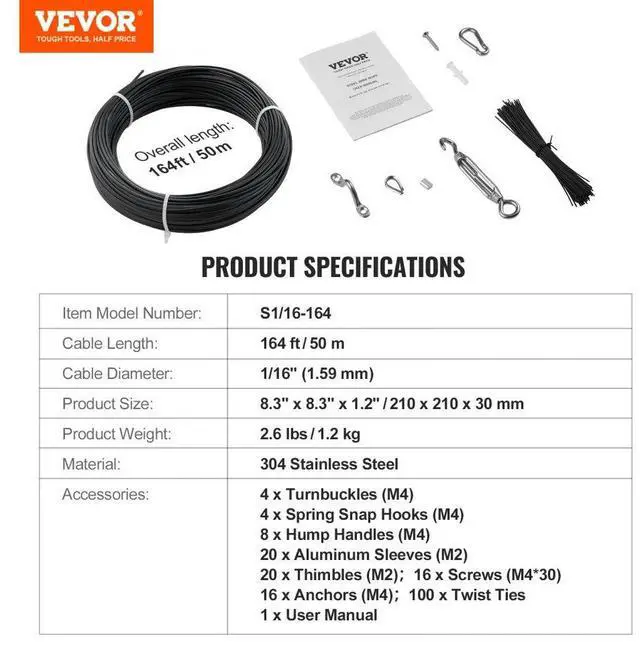 Item Model Number: S1/16-164,Product Weight: 2.6 lbs/1.2 kg,Cable Diameter: 1/16" / 1.59 mm,Cable Length: 164 ft/50 m,Material: 304 Stainless Steel+PVC Coating,Product Size: 8.3" x 8.3" x 1.2"/21 x 21 x 3 cm