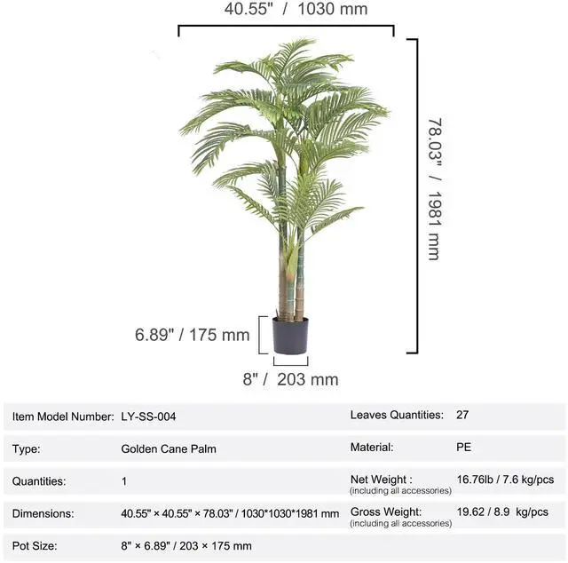 Type: Gold Cane Palm Tree,Pot Size: 8" x 6.98" / 203 x 175 mm,Net Weight (including all accessories): 16.76 lb / 7.6 kg,Item Model Number: LY-SS-004,Dimensions: 40.55" x 40.55" x 78.03" / 1030 x 1030 x 1981 mm,Quantities: 1,Material: PE
