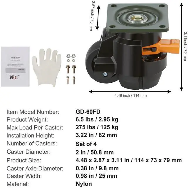 Caster Axle Diameter: 0.38 in / 9.8 mm