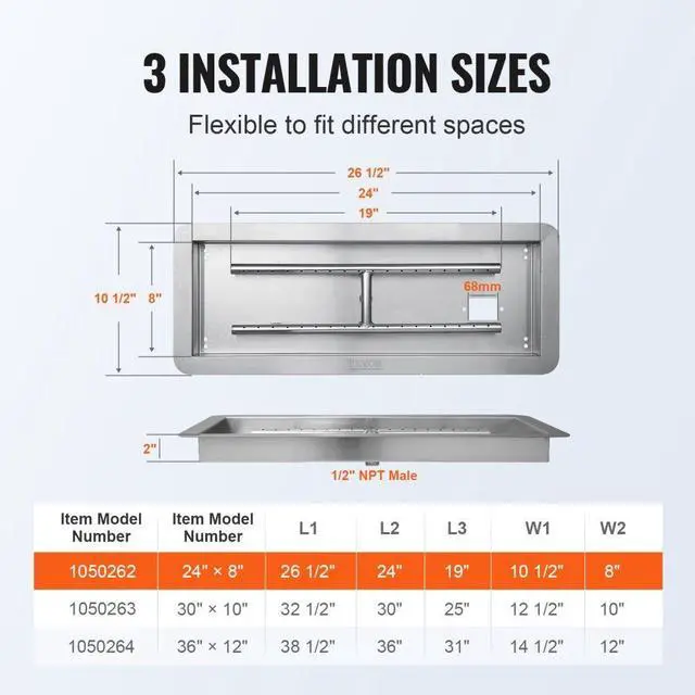 Installation: Drop-in,Installation Size: 24" × 8"/609.6 mm × 203.2 mm,Pan Body: SUS201, 1mm thickness,Drill Hole Diameter: 3 mm/0.12",Number of Drill Holes: 36,Applicable Gas Types: Propane, Natural Gas,Item Model Number: 1050262,Maximum Heat Output (BTU): 120,000,Burner: SUS304, 1mm thickness,Product Dimensions (L x W x H): 26.50" × 10.51" × 2.91"/673 × 267 × 74 mm,Net Weight: 9.92 lb/4.5 kg