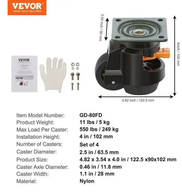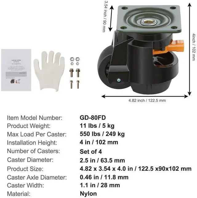 Caster Diameter: 2.5 in / 63.5 mm,Number of Casters: 4,Installation Height: 4.01 in / 102 mm,Item Model Number: GD-80FD,Product Weight: 11.02 lbs / 5 kg,Material: Nylon,Caster Width: 1.1 in / 28 mm,Caster Axle Diameter: 0.46 in / 11.8 mm,Product Size: 4.82 x 3.54 x 4.01 in / 122.5 x 90 x 102 mm,Max Load Per Caster: 550 lbs / 250 kg
