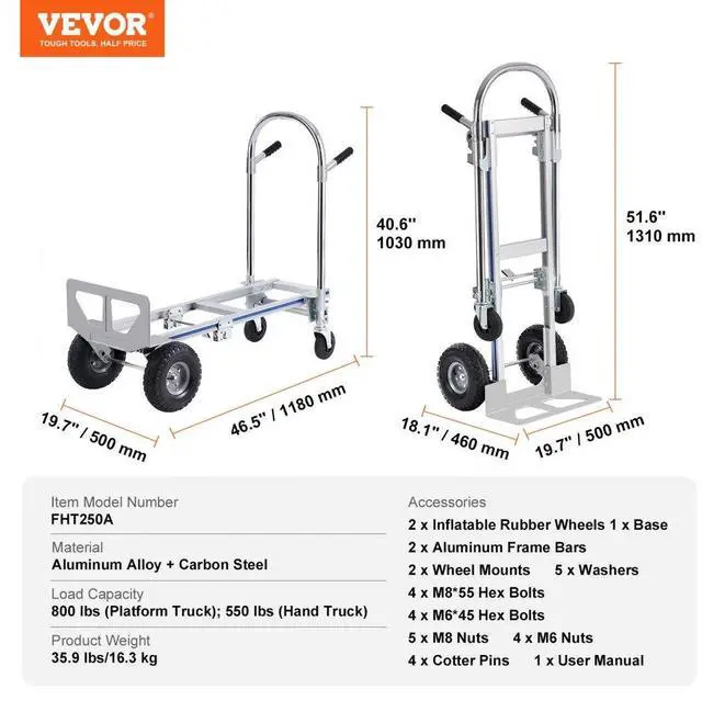 Load Capacity: 800 lbs/363 kg (Platform Truck); 550 lbs/249 kg (Hand Truck),Item Model Number: FHT250A,Product Weight: 35.9 lbs/16.3 kg,Material: Aluminum Alloy + Carbon Steel,Hand Truck Mode Size: 19.7"L x 18.1"W x 51.6"H/500 x 460 x 1310 mm,Platform Truck Mode Size: 19.7"L x 46.5"W x 40.6"H/500 x 1180 x 1030 mm