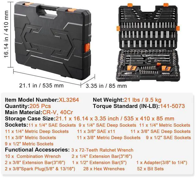 Torque Standard: 141-5073 in-lb,Item Model Number: XL3264,Quantity: 205 Pcs,Storage Case Size: 21.1 x 16.14 x 3.35 inch / 535 x 410 x 85 mm,Net Weight: 21 lbs / 9.5 kg,Main Material: CR-V, 40Cr