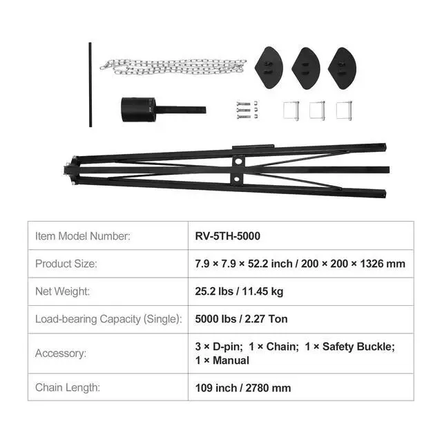Rated Capacity: 3333 lbs,Height Range: 35"-57"/880-1450 mm,Item Model Number: RV-5TH-5000,Quantity: 1 Set,Material: Q235, 45# Steel,Max. Capacity: 5000 lbs,Chain Length: 109 inch/2780 mm,Net Weight: 25.2 lbs/11.45 kg,Product Size: 7.9 x 7.9 x 52.2 inch/200 x 200 x 1326 mm