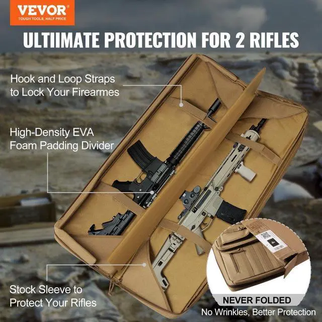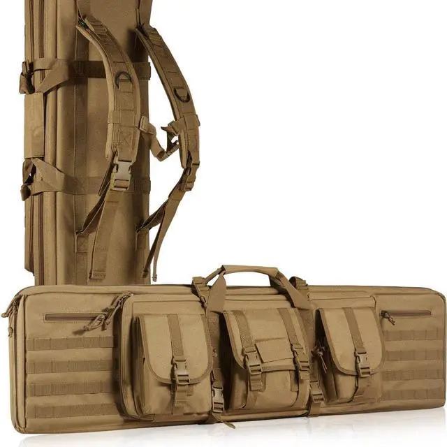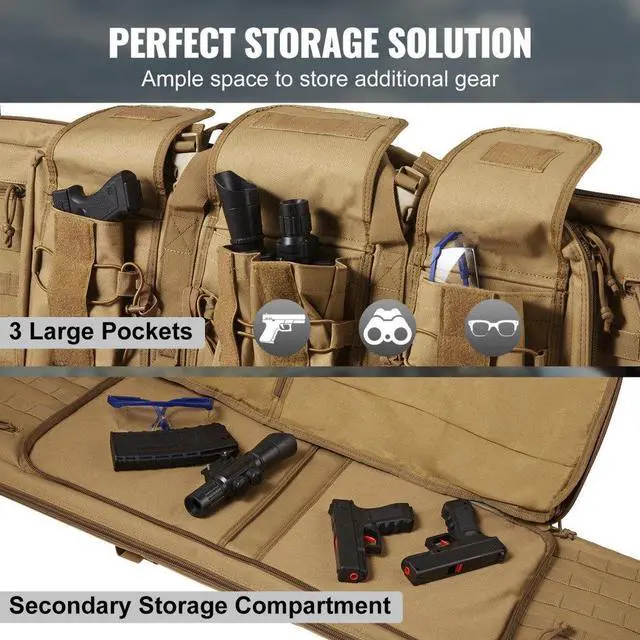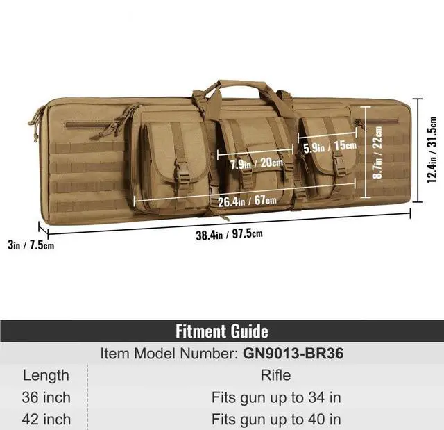 Rifle Capacity: 2 Rifles and 2 Pistols,Fixing Method: Adhesive Tape,Waterproof: Daily Waterproof,Color: Brown,Item Model Number: GN9013-BR36,Length 36 in: Fits gun up to 34 in,Material: 600D Polyester,Features: Molle System, Lockable Zipper,Foldable: Non-folding,Weight: 6.64 lbs/3.01kg,Product Size: 38.4x12.4x3 in/975x315x75 mm