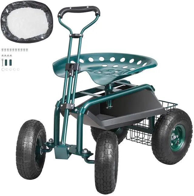 VEVOR Garden Cart Rolling Workseat with Wheels, Gardening Stool for Planting, 360 Degree Swivel Seat, Wagon Scooter with Steering Handle & Utility Tool Tray, Use for Patio, Yard, and Outdoors, Green