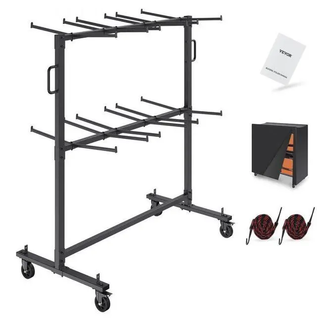 VEVOR Folding Chair Cart, Double Layer Mobile Stackable Chair Dolly, Storage Rack Trolley with 530 Lbs Capacity to Store 84 Chairs, Heavy Duty Iron Chairs Holder with 4 Casters, 2 Elastic Cords, Cover
