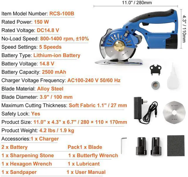 Blade Material: Alloy Steel,Blade Diameter: 3.9" / 100 mm,Battery Voltage: 14.8 V,Battery Type: Lithium-ion Battery,Maximum Cutting Thickness: Soft Fabric 1.1" / 27 mm,Rated Voltage: DC14.8 V,Product Size: 11.0" x 4.3" x 6.7" / 280 × 110 × 170mm,Safety Lock: Yes,Battery Capacity: 2500 mAh,Charger Voltage Frequency: AC100-240 V 50/60 Hz,Item Model Number: RCS-100B,Product Weight: 4.2 lbs / 1.9 kg,Rated Power: 150 W,No-Load Speed: 800-1400 rpm, ±10%,Speed Settings: 5 Speeds