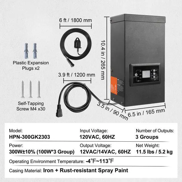 Casing Material: Iron + Rust-resistant Spray Paint,Item Model Number: HPN-300GK2303,Operating Environment Temperature: -4 to 113,Input Voltage: 120V AC,60 Hz,Product Dimensions (L x W x H): 10.4 x 6.5 x 3.5 in/265 x 165 x 90 mm,Output Voltage: 12V AC,60 Hz,Net Weight: 11.5 lbs /5.2 kg,Power: 300W±10%,Number of Outputs: 3
