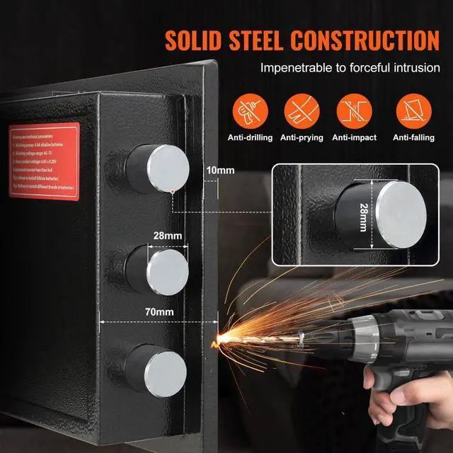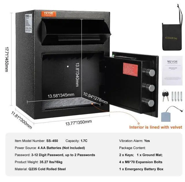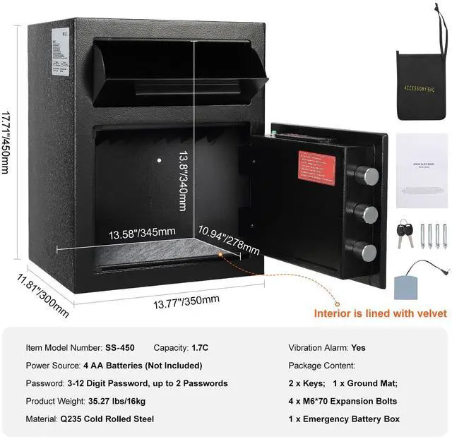 Interior Dimensions: 13.58x10.94 x13.38 inch/345x278x340 mm,Vibration Alarm: Yes,Capacity:1.7C,Power Source: 4 AA Batteries (Not Included),Item Model Number: SS-450,Product Weight: 35.27 lbs/16kg,Product Size(LxWxH): 13.77x11.81x17.71 inch/350x300x450 mm,Material: Q235 Cold Rolled Steel,Password: 3-12 Digit Password, up to 2 Passwords