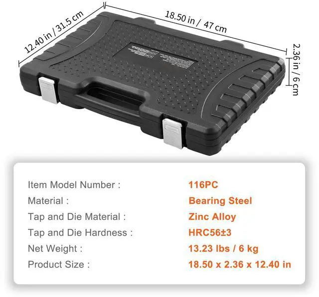 Tap and Die Hardness: HRC56±3,Item Model Number: 116PC,Material: Bearing Steel,Net Weight: 13.23 lbs / 6 kg,Tap and Die Wrench Material: Zinc Alloy,Product Size: 18.50 x 2.36 x 12.40 inch / 47 x 6 x 31.5 cm