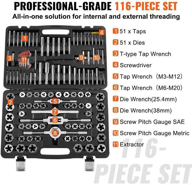 • VEVOR Tap and Die Set, 116-Piece Include Metric and SAE Size, Bearing Steel Taps and Dies, Essential Threading Tool for Cutting External Internal Threads, with Complete Accessories and Storage Case