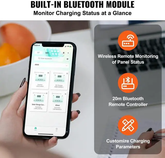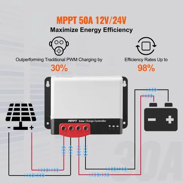 VEVOR 50A MPPT Solar Charge Controller, 12V / 24V Auto DC Input, Solar Panel Regulator Charger with Bluetooth Module, 98% Charging Efficiency for Sealed(AGM), Gel, Flooded and Lithium Battery Charging