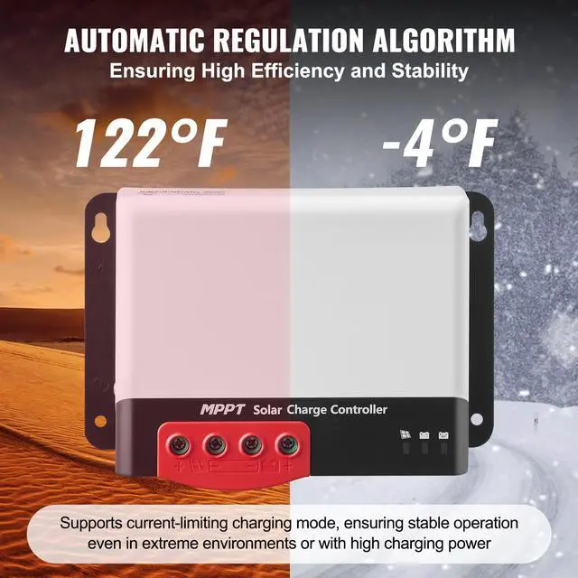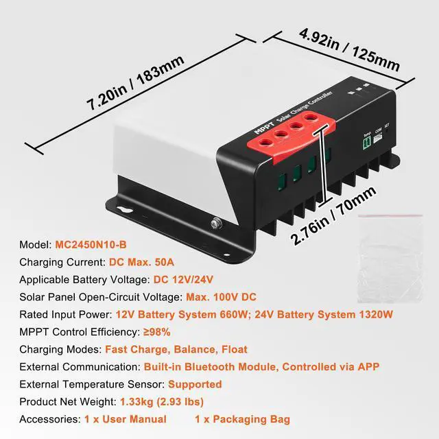 Primary Material: ABS+PC,Package Dimensions: 240 x 190 x 130 mm/9.45 x 7.48 x 5.1 inches,Solar Panel Open-Circuit Voltage: Max. 100V DC,Operating Temperature Range: -20°C to 50°C/-4°F to 122°F,Applicable Battery Voltage(DC): 12V/24V Auto,Product Dimensions: 183 x 125 x 70 mm/7.2 x 4.92 x 2.76 inches,Rated Input Power: 12V/660W; 24V/1320W,MPPT Control Efficiency: 98%,Item Model Number: MC2450N10-B,External Communication: Built-in Bluetooth Module, Controlled via Neutral APP,Product Net Weight: 1.33 kg/2.93 lbs,External Temperature Sensor: Supported,Charging Modes: Fast Charge, Balance, Float,Charging Current(DC): Max. 50A