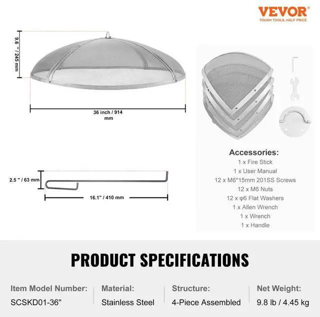 Interior Dimensions: 35 x 8.5 inch / 895 x 215 mm,Item Model Number: SCSKD01-36",Material: Stainless Steel,Mesh Wire Diameter: 0.03 inch / 0.8 mm,Mesh Hole Diameter: 0.08 inch / 2 mm,Structure: 4-Piece Assembled,Product Dimensions: 35.8 x 9.6 inch / 910 x 245 mm,Diameters: 36 inch / 914 mm,Net Weight: 9.8 lb / 4.45 kg,Fire Poker Dimensions: 16.1 x 2.5 x 0.2 inch / 410 x 63 x 6 mm