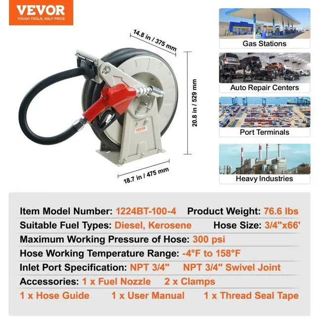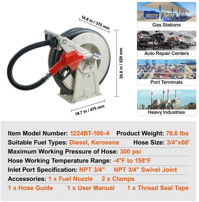 Inlet Port Specification: NPT 3/4",Working Temperature: -4 to 158/ -20 to 70,Item Model Number: 1224BT-100-4,Product Weight: 76.6 lbs/34.78 kg,Hose Size: 3/4" x 66',Suitable Fuel Types: Diesel, Kerosene,Max Working Pressure: 300 psi,Product Size: 18.7" x 14.7" x 20.8"/475 x 375 x 529 mm