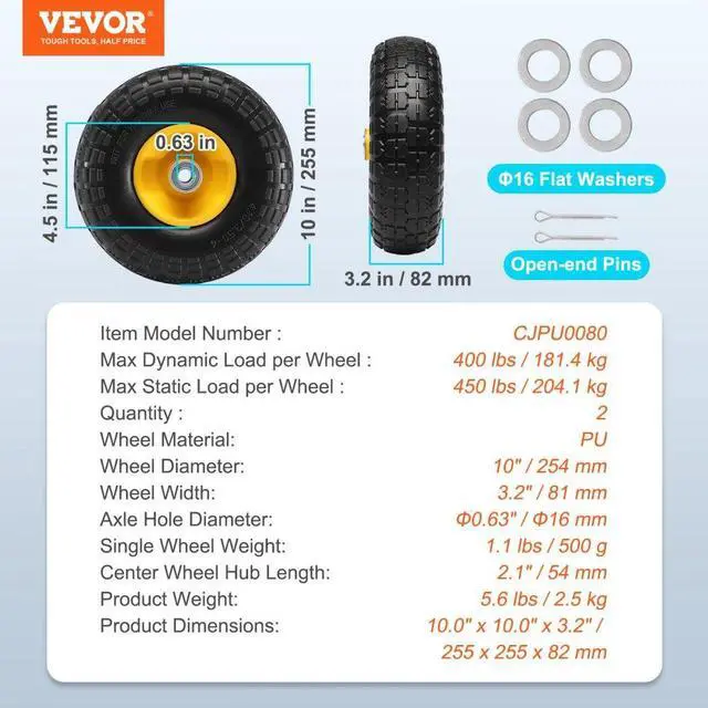 Center Wheel Hub Length: 2.1" / 54 mm,Single Wheel Weight: 1.1 lbs / 500 g,Axle Hole Diameter: 0.63" / 16 mm,Quantity: 2,Product Dimensions: 10.0" x 10.0" x 3.2" / 254 x 254 x 81 mm,Wheel Material: PU,Wheel Inner Diameter: 4.5" / 115 mm,Item Model Number: CJPU0080,Max Static Load per Wheel: 450 lbs / 204.1 kg,Product Weight: 5.6 lbs / 2.5 kg,Max Dynamic Load per Wheel: 400 lbs / 181.4 kg,Wheel Diameter: 10" / 254 mm,Wheel Width: 3.2" / 81 mm
