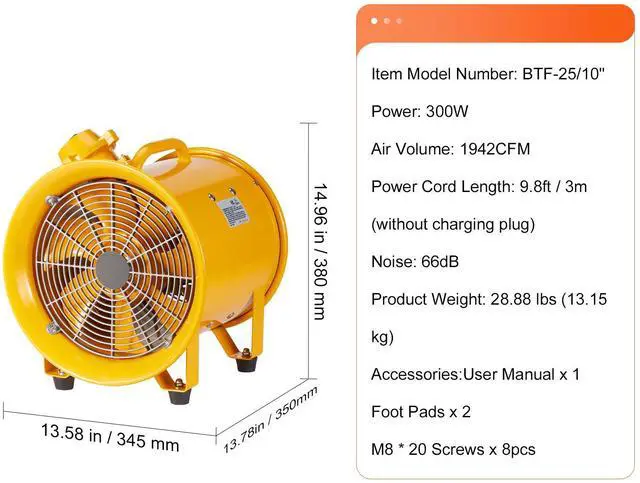 Power Cord Length: 9.8ft / 3m (without charging plug),Speed: 2850rpm,Air Volume: 1942CFM,Noise: 66dB,Item Model Number: BTF-25/10",Product Weight: 28.88 lbs (13.15 kg),Product Dimensions: 13.78 x 18 x 14.96 inches (350 x 345 x 380 mm),Power: 350W,Power Supply: AC120V 60Hz