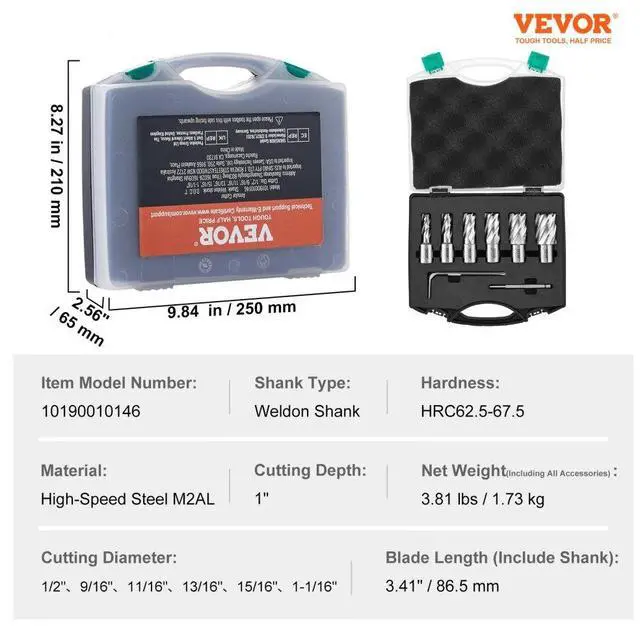 Carrying Case Dimensions: 9.84 x 8.27 x 2.56 in / 250 x 210 x 65 mm,Net Weight (Including All Accessories): 1.65 lbs / 0.75 kg,Cutting Depth: 1",Item Model Number: 10190010146,Material: High-Speed Steel M2AL,Shank Type: Weldon Shank,Hardness: HRC62.5-67.5,Blade Length (Include Shank): 2.42" / 61.5 mm,Cutting Diameter: 1/2", 9/16", 11/16", 13/16", 15/16", 1-1/16"