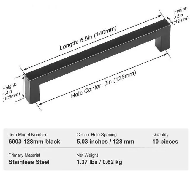 Primary Material: Stainless Steel,Item Dimensions (L x W x H): 5.51 x 0.47 x 1.38 inches / 140 x 12 x 35 mm,Net Weight (including all accessories): 1.37 lbs / 0.62 kg,Center Hole Spacing: 5.03 inches / 128 mm,Gross Weight (including accessories and packaging): 1.54 lbs / 0.7 kg,Item Model Number: 6003-128mm-black,Quantity: 10 pieces
